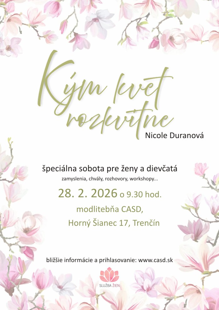 pozývame vás v sobotu 28.2.2026 na výnimočný program pripravený pre ženské pokolenie. Radi by sme spolu prežili príjemný čas v duchu nám blízkych tém a pripomenuli si, čo nám v živote môže priniesť trpezlivosť a dôvera v Božie načasovanie. Dopoludním nás bude sprevádzať Nicole Duranová a pre poobedie sú pripravené zaujímavé workshopy, ktoré môžu každú z nás niečím obohatiť.
